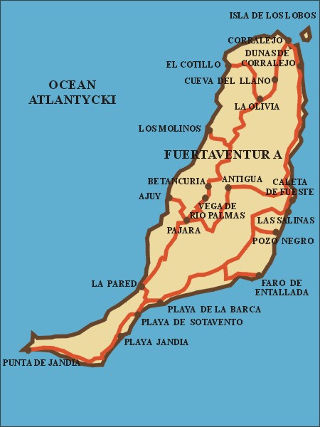 Leżąca zaledwie 100 km od wybrzeża Afryki Fuerteventura jest najstarszą wyspą z całego archipelagu. Zamieszkana przez plemię Mojos, została podbita na początku XV w. przez Jeana de Bethencourt, działajacego w imieniu króla Kastylii. Fuerteventura często nazywana jest "kozią wyspą", ponieważ dominującym zwierzęciem hodowlanym są tutaj kozy. Można je spotkać dosłownie wszędzie, czego doświadczyliśmy osobiście zwiedzając wyspę samochodem. Pojedynczo, parami lub w małych stadach przemierzają łagodne zbocza zerodowanych wulkanów w poszukiwaniu pożywienia. Wszechobecne kozy odcisnęły swoją obecność nawet w nazwach miejscowości. Puerto de Cabras czyli "kozi port" to stara nazwa obecnej stolicy wyspy Puerto de Rosario.Sierpień 2015