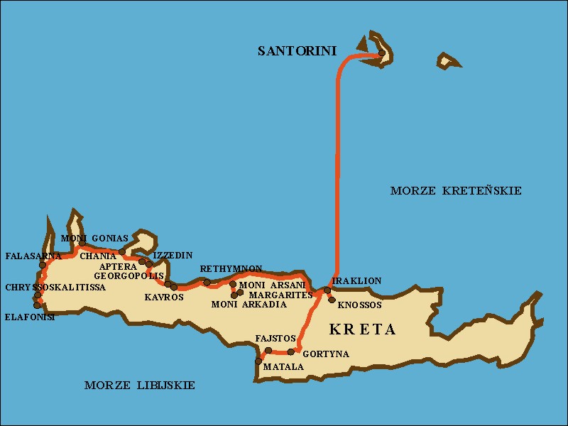 Jako miejsce wypoczynku wybraliśmy miejscowość Kavros na północnym wybrzeżu Krety, które słynie z przepięknych, szerokich piaszczystych plaż. Trafiliśmy na mały, rodzinny hotelik, co przy niewielu mankamentach okazało się wielkim plusem. Gospodarz był bowiem bardzo gościnnym człowiekiem, poświęcając swoim gościom znacznie więcej uwagi, niż wymagały tego jego obowiązki. Do hotelowego baru zaglądali także po pracy miejscowi, z którymi doskonale integrowaliśmy się przy szklaneczkach ouzo czy zimnym piwku. W trakcie pobytu poznaliśmy młode małżeństwo z Krakowa z którym wspólnie zwiedziliśmy zachodnią Kretę wypożyczonym samochodem.Wybrzeże Morza Kreteńskiego